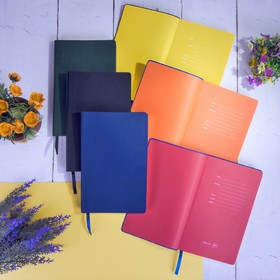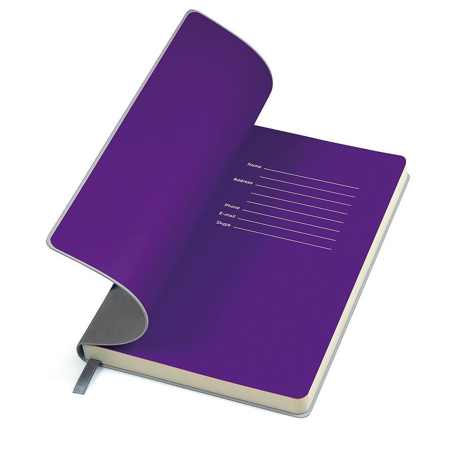 Блокнот,с мягкой термоактивной обложкой и,популярной,комбинацией цветов Термоактивный PU материал,Velvet Цвет обложки, близкий к Pantone 423C Цвет форзаца, близкий к Pantone Violet 2613U Внутренний блок 256 страниц,в линейку Идеально скругленные углы блока Перфорированные,8 последних листов Кремовая FSC бумага,70 г/м2 Ляссе в тон обложки Индивидуальная упаковка: фирменный сливбокс thINKme
