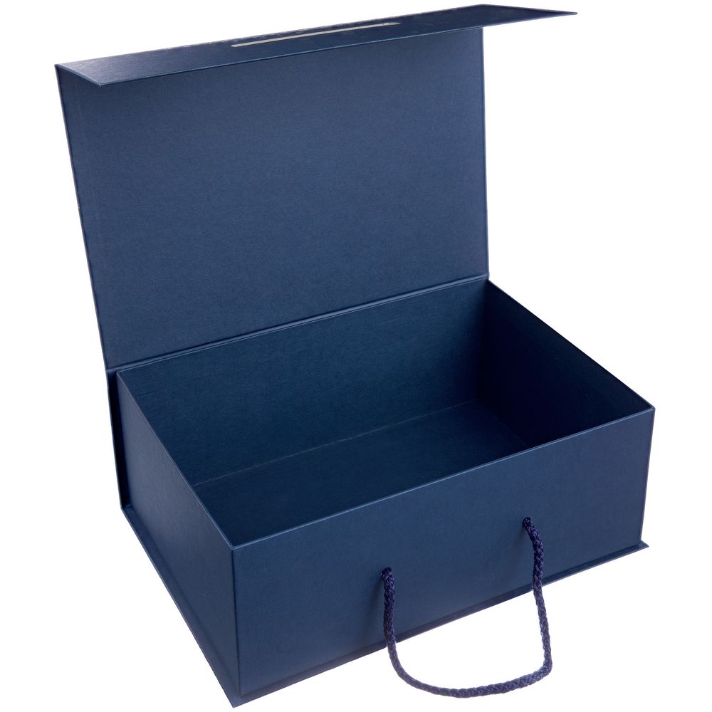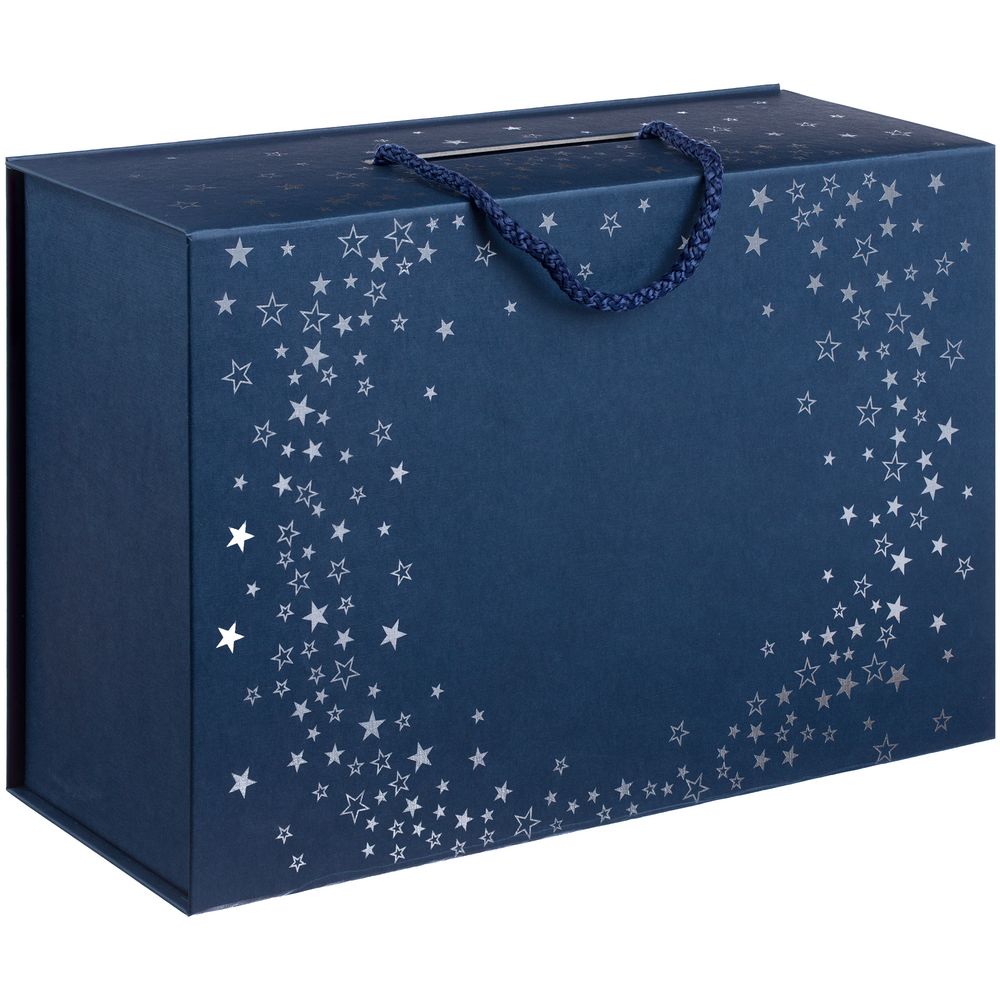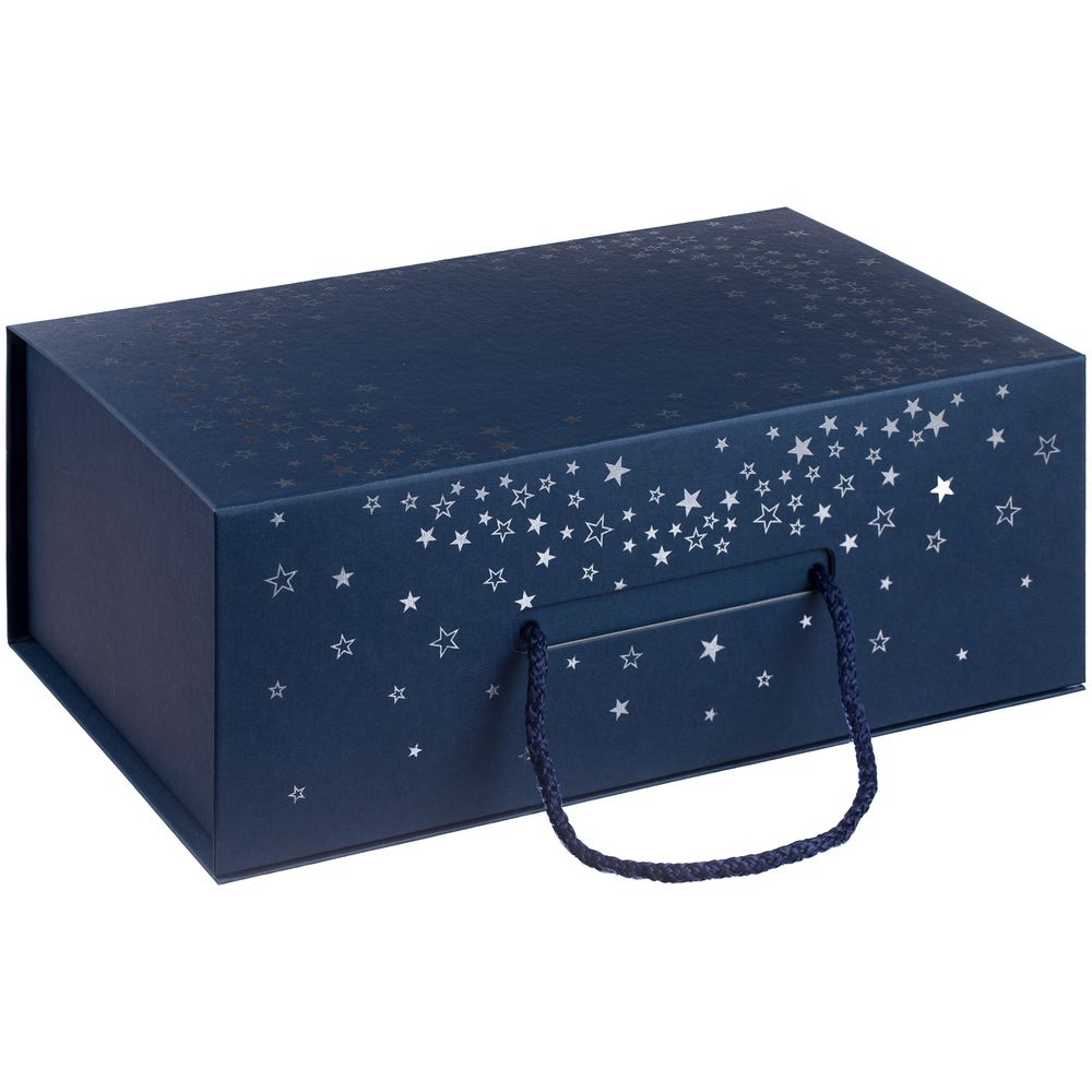 Подарочная коробка Serebrinka, кашированная дизайнерской бумагой глубокого синего цвета, с легкостью поможет создать праздничное настроение. Изящный узор из звезд выполнен серебристой краской в технике шелкографии, а глянцевая УФ-лакирование на некоторых элементах придает изделию особый блеск и шарм.
