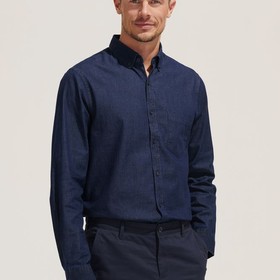 Модель классического кроя из денима с воротником на пуговицах, планкой на 7 пуговиц в тон и манжетами на 1 пуговице.