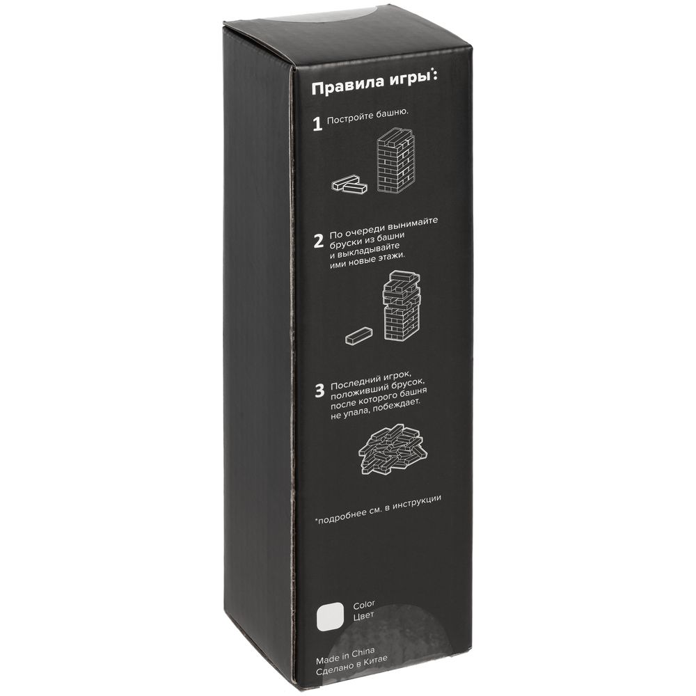 Второе название игры — «Падающая башня». Сначала строится башня: по три брусочка в ряд, каждый слой перпендикулярен предыдущему. Затем игроки по очереди вытаскивают по одному брусочку и кладут его на верх сооружения. Тот игрок, кто обрушит башню, проиграл. Игра тренирует ловкость, внимание, терпение и пространственное мышление, что очень важно и в бизнесе. Так что подарок не только развлечет, но и может стать символом-пожеланием.