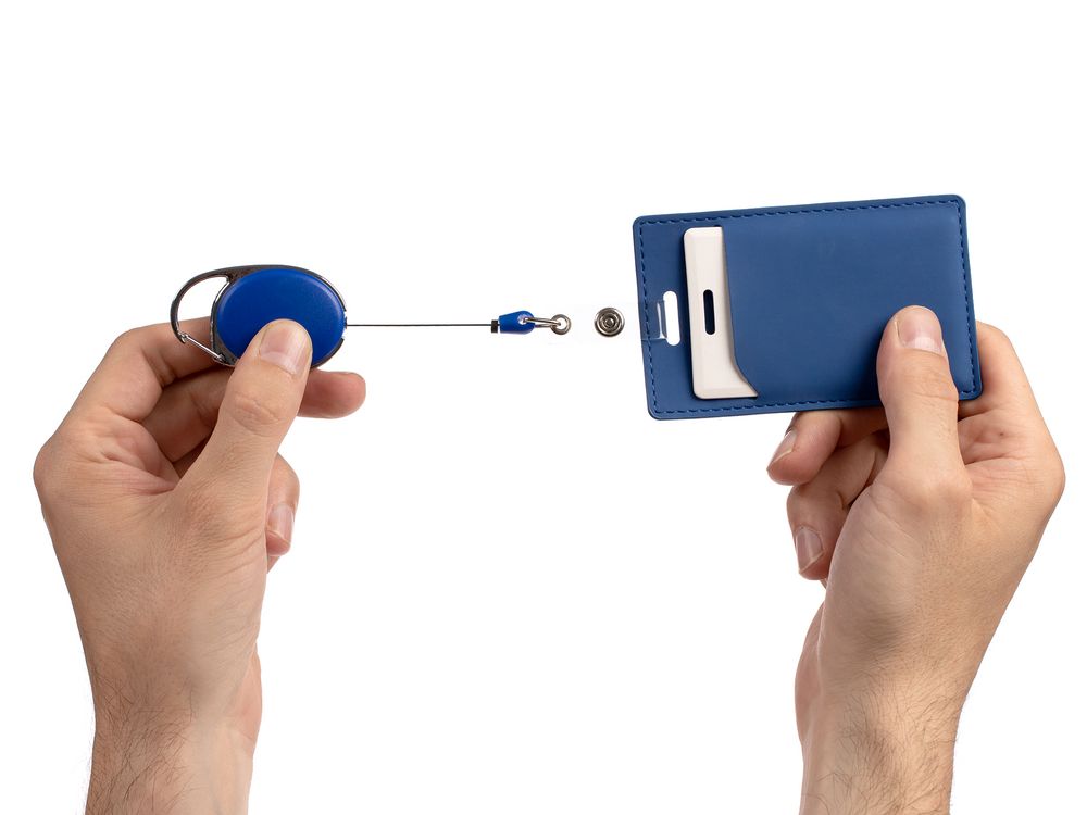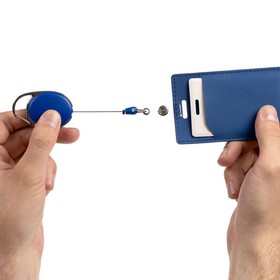 Ретрактор крепится к одежде с помощью карабина, а с другой стороны можно поместить бейдж, визитку или магнитную карту. В корпусе спрятан сворачивающийся шнур, который позволяет при необходимости демонстрировать содержимое держателя, не снимая его.