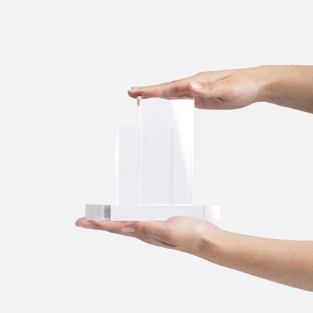 Элегантные линии и прозрачный материал придают стеле Doublet эстетическую привлекательность, позволяя ей гармонично сочетаться с любым интерьером — от офисов до выставочных залов. Акрил (оргстекло) отличается прочностью и легкостью, что обеспечивает долговечность и устойчивость к повреждениям. Благодаря двухуровневой конструкции стела станет прекрасным холстом для идей и творчества и позволит создать уникальную награду со множеством элементов дизайна.