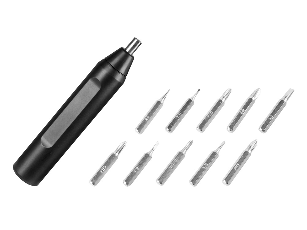 Отвертка-ручка «Drill» это универсальная отвертка с сменными битами. Благодаря форме корпуса идеально лежит в руке. Отвертка легкая и занимает мало места. Выдвижной механический контейнер бит позволяет хранить в себе весь набор из 10 сменных бит. Ручка инструмента изготовлена из пластика, биты – из нержавеющей стали.
