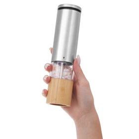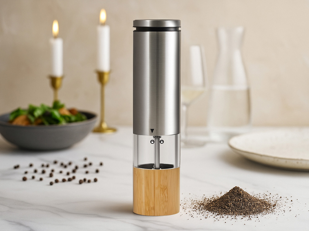 Элегантный и практичный корпоративный подарок, который добавит вкуса в любую кухню — электрическая мельница для специй, сочетающая трендовый дизайн и современную функциональность. Работает от 6 батареек AAA и легко справляется с солью, перцем и другими специями.
