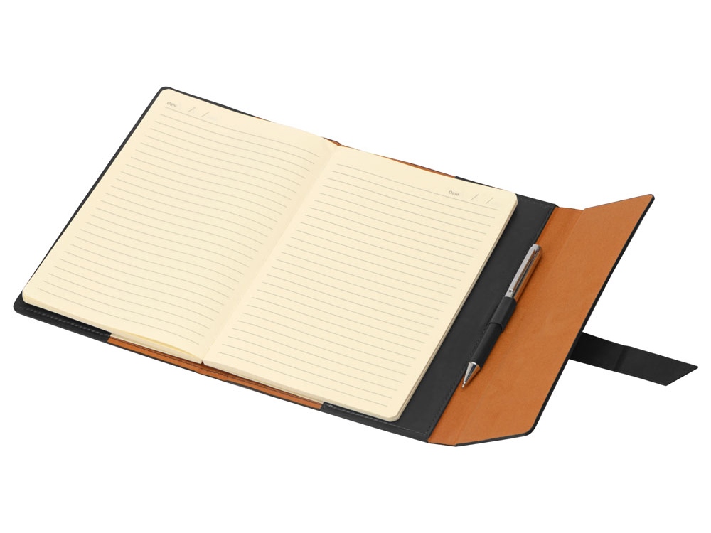 Бизнес-блокнот формата А5 в твердой обложке из искусственной кожи станет отличным подарком для любого клиента. Блокнот состоит из обложки с клапаном и сменного блока с линованными страницами. Внутри обложки есть петля для ручки в тон (ручка в комплект не входит).