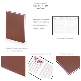 Датированный ежедневник «IDEAL NEW». Блок содержит 336 страниц белой бумаги плотностью 60 г/кв.м. Обложка - классический итальянский переплетный материал на бумажной основе ,устойчивый к истиранию. Справочная информация на 16 страницах.