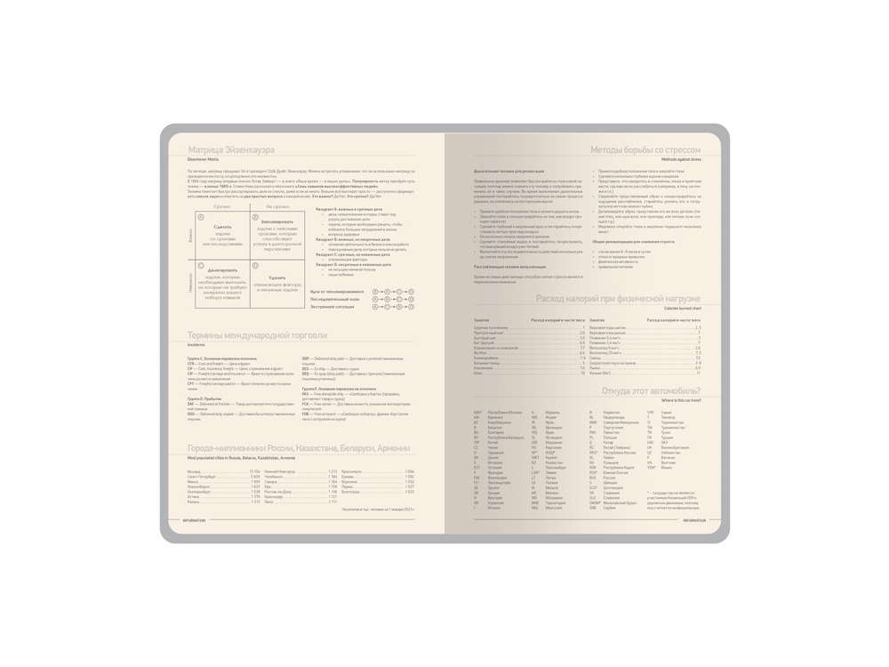 Блок изготовлен из бежевой бумаги плотностью 70 г/м2 и помимо раздела для планирования рабочего времени включает в себя 12 страниц справочной информации.