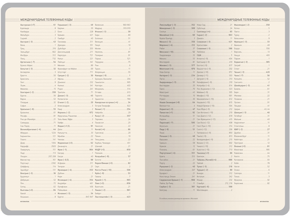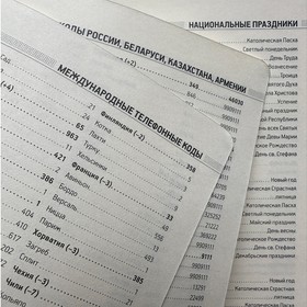 • справочная информация на 19 страницах (аэропорты Европы, штрихкоды, международные телефонные коды, цифровые автомобильные коды, энергетическая и питательная ценность продуктов, национальные и религиозные праздники, единицы измерения, страны мира, размеры одежды, форматы бумаги и др.);