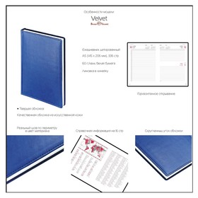 В серии Velvet представлены практичные и стильные модели ежедневников, в которых обложки выполнены из кожзаменителя с рельефом и прострочены по периметру декоративным швом. Закругленные уголки подчеркивают привлекательную и изящную форму ежедневника.