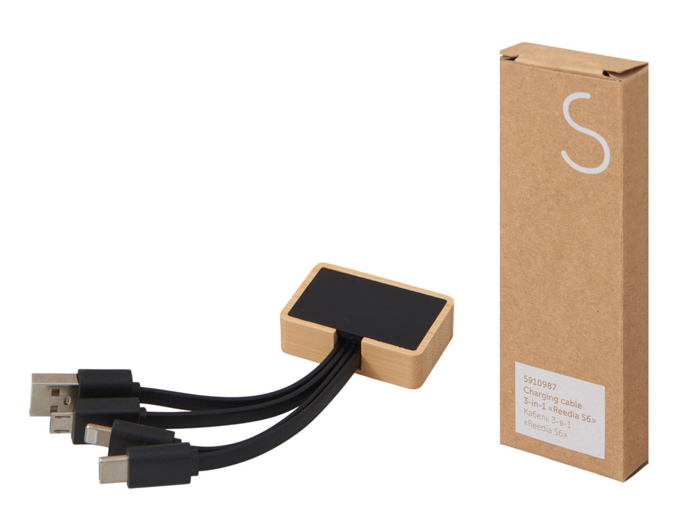 Кабель 3-в-1 с подсветкой лого «Reedia S6», бамбук, черный