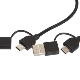 Кабель оснащён всеми популярными типами разъёмов — USB-C, USB-A, Lightning — что позволяет использовать его с широким спектром устройств: смартфонами, планшетами, наушниками, портативными колонками и другими гаджетами.