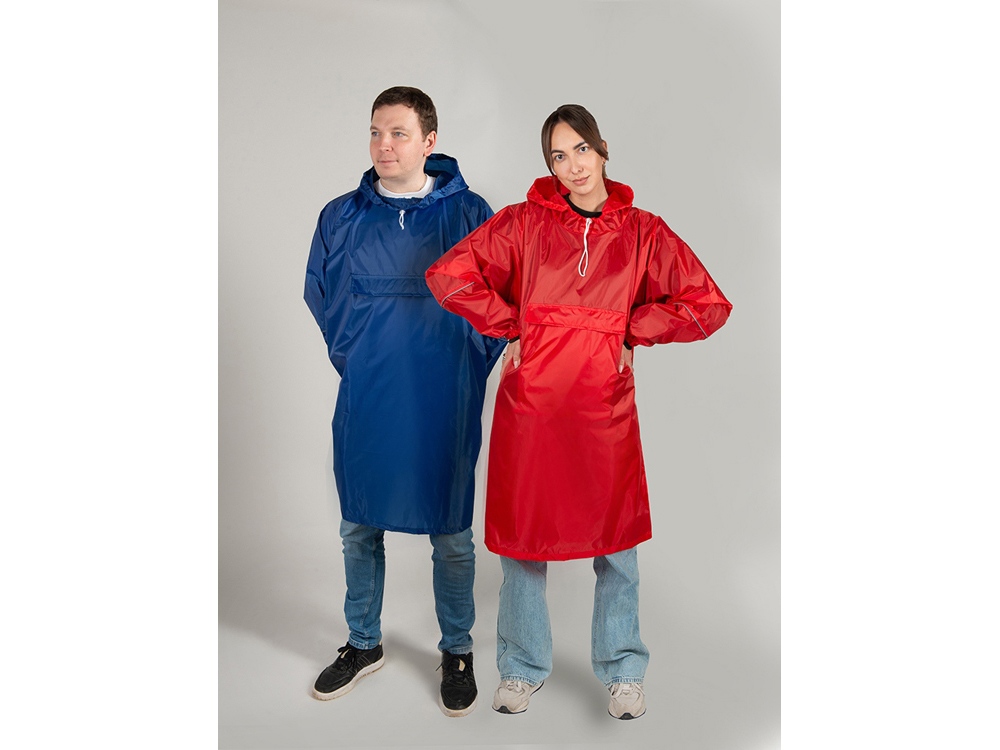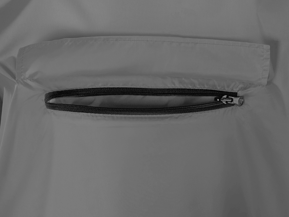 Дождевик - пончо прямого силуэта. Нагрудный карман плаща закрывается на молнию, которая дополнительно защищена клапаном, а еще в него можно полностью убрать дождевик. На дне кармана — ручка-петелька, которая в сложенном виде может использоваться для подвешивания.
