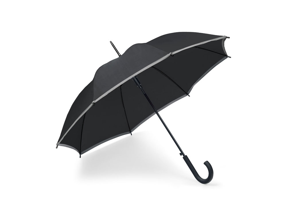 Полуавтоматический зонт-трость из полиэстера со светоотражающей окантовкой и прорезиненной ручкой. Вид нанесения, рекомендуемый поставщиком: трансфер, текстильный принтер